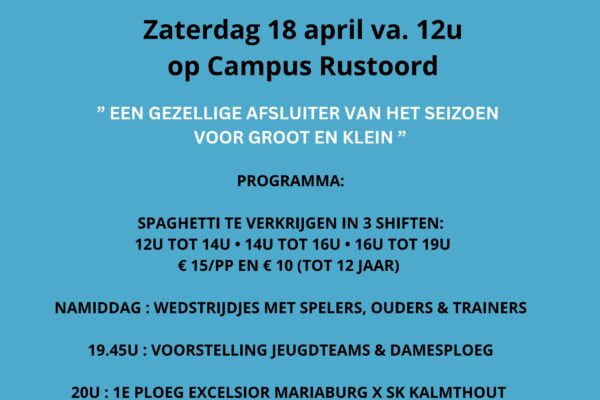 Op zaterdag 18 april 2026 organiseren we een gezellige Familiedag van Excelsior Mariaburg op onze CAMPUS RUSTOORD. Het wordt een dag vol sfeer, lekker eten, leuke activiteiten, en als afsluiter de laatste thuiswedstrijd van onze 1e ploeg tegen SK Kalmthout.