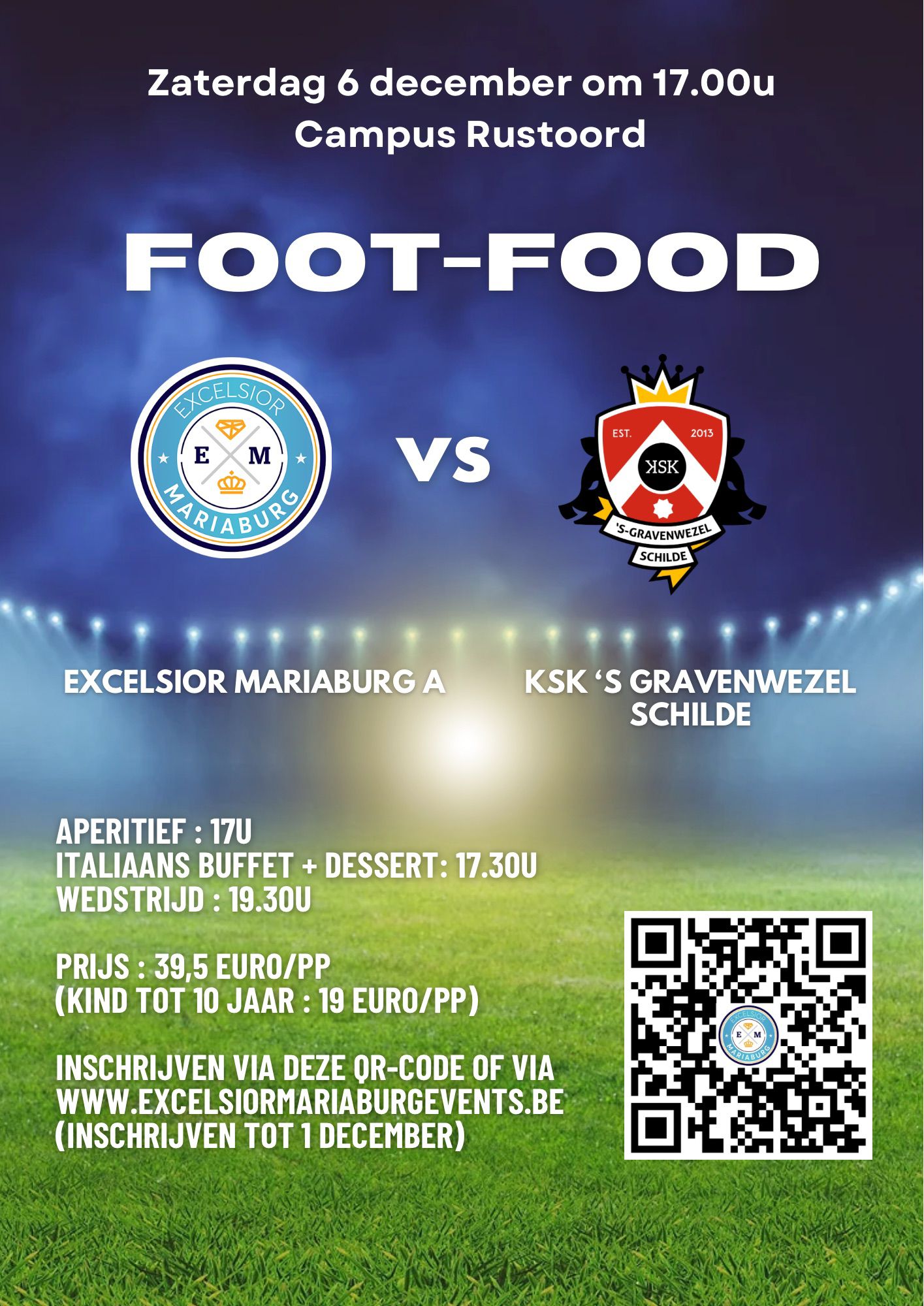 Geniet van het Italiaanse buffet en dessert, en steun onze eerste ploeg bij hun wedstrijd tegen ’s Gravenwezel-Schilde! 🇮🇹